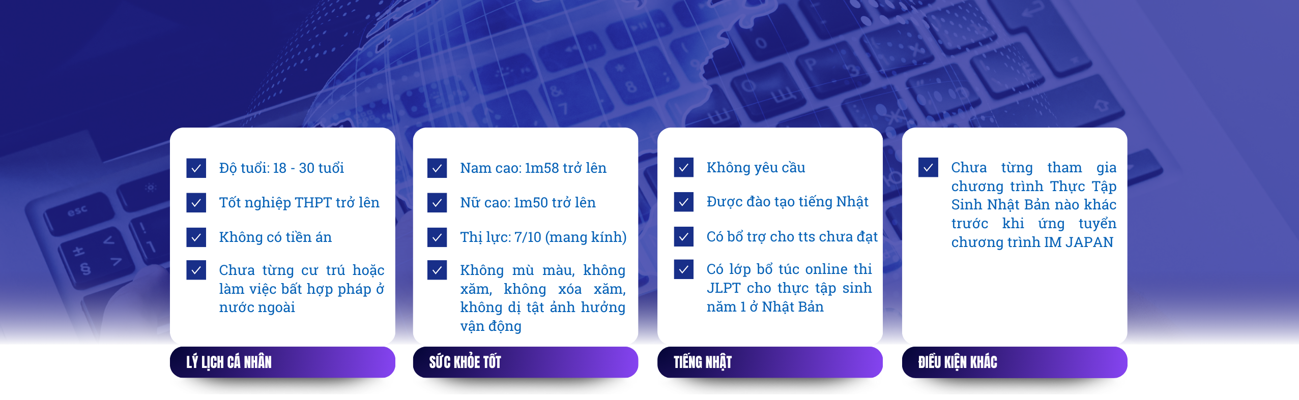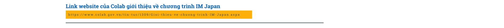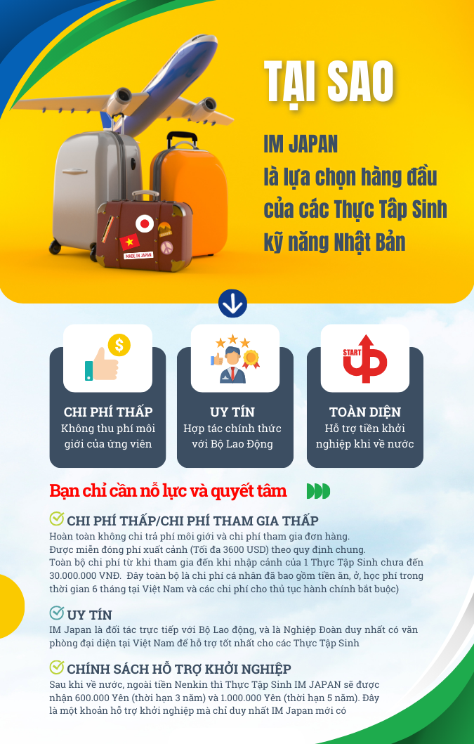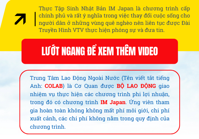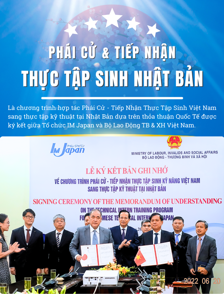 Là Cơ Quan được BỘ LAO ĐỘNG giao nhiệm vụ thực hiện các CHƯƠNG TRÌNH PHI LỢI NHUẬN, trong đó có chương trình IM JAPAN. Ứng viên tham gia hoàn toàn không không mất phí môi giới, chi phí xuất cảnh, các chi phí không nằm trong quy định của chương trình.