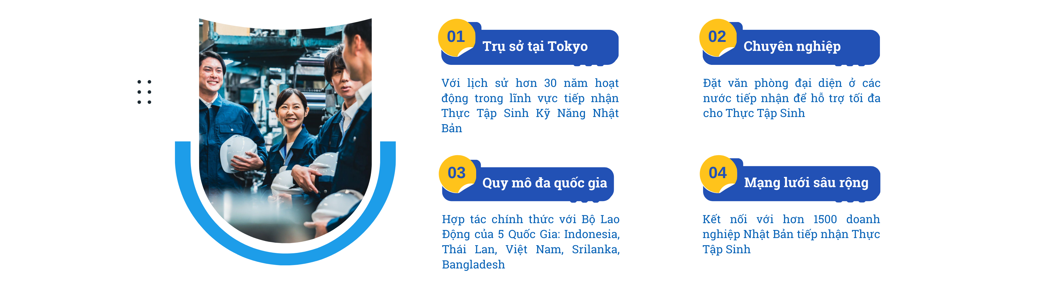 Là Nghiệp Đoàn DUY NHẤT có văn phòng đại diện tại 05 Quốc Gia đang hợp tác để thực hiện hỗ trợ CÔNG TÁC TUYỂN CHỌN – ĐÀO TẠO VÀ PHÁI CỬ dựa trên thỏa thuận hợp tác được KÝ TRỰC TIẾP với Bộ Lao động của các quốc gia này.